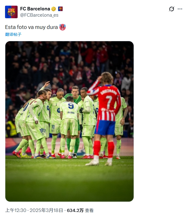 在2025年3月17日,马竞主场2-4不敌巴萨。赛后巴萨官方晒图写道:“这张照片太狠了”