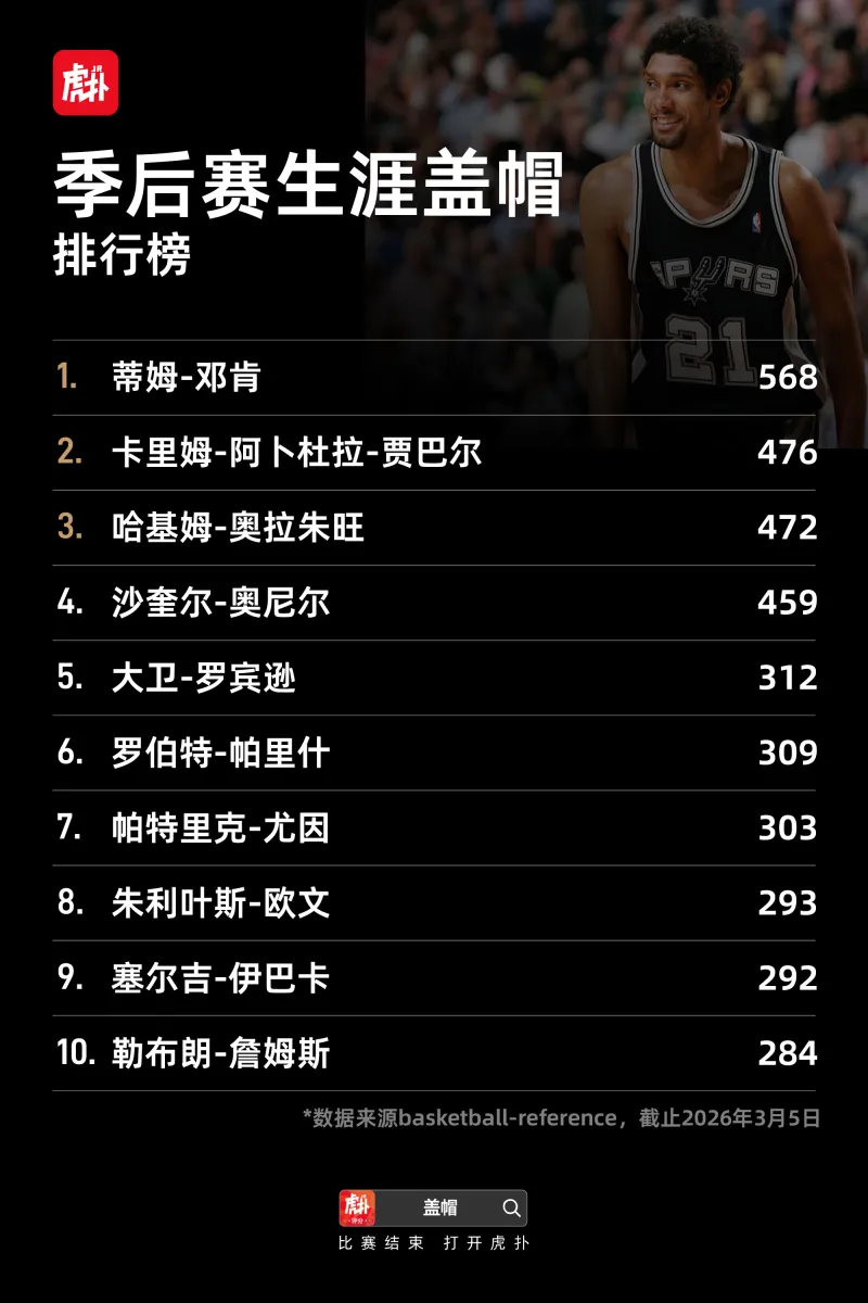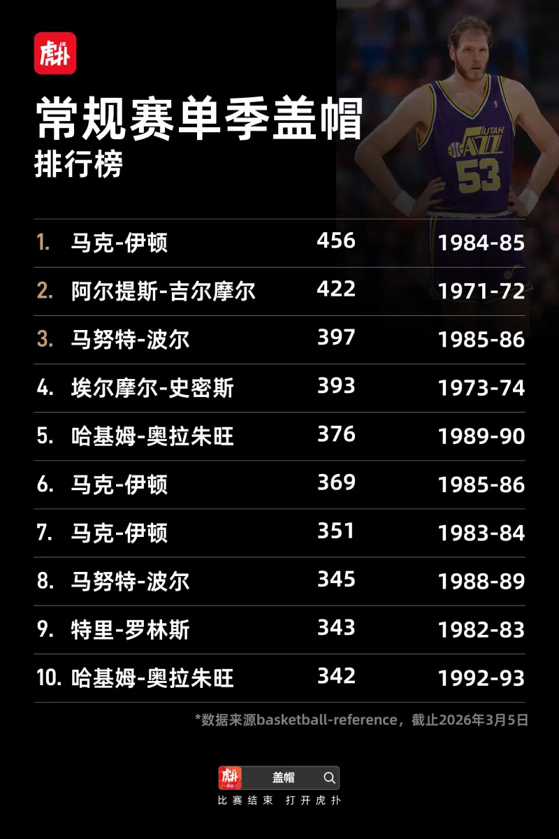 一起来看看常规赛&季后赛盖帽排行榜数据吧