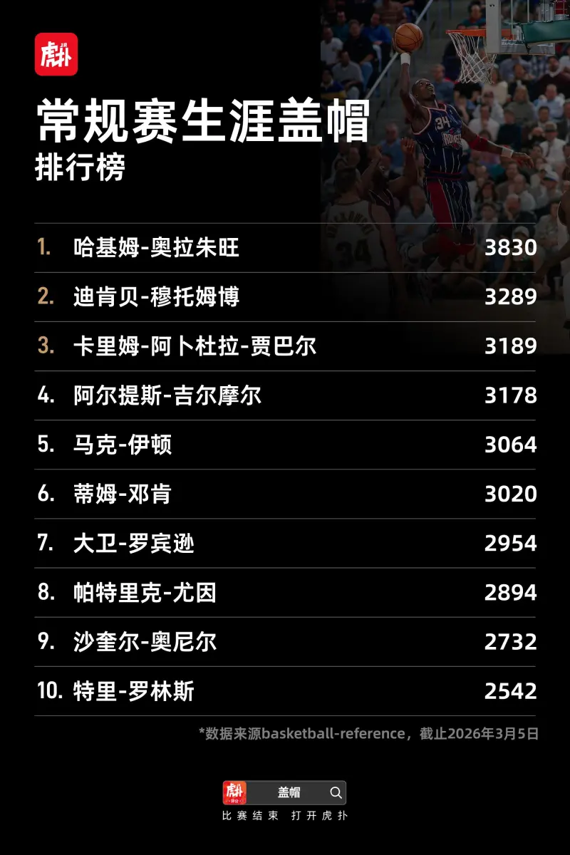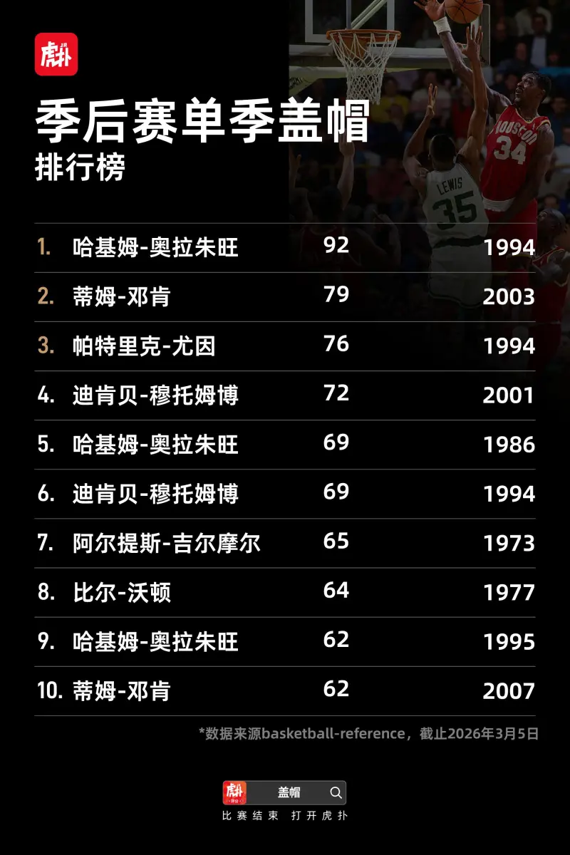 开云网页版中国官网-盖帽排行榜:“大梦”奥拉朱旺3830次排名常规赛历史第一